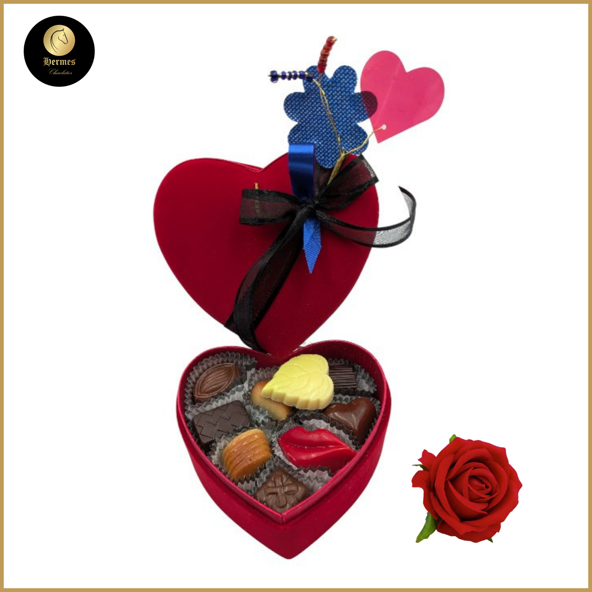Een elegant en warm geschenk: deze fluweelzachte rode hartendoos is gevuld met 16 ambachtelijke pralines, met liefde en vakmanschap gemaakt rechtstreeks in ons chocoladeatelier.