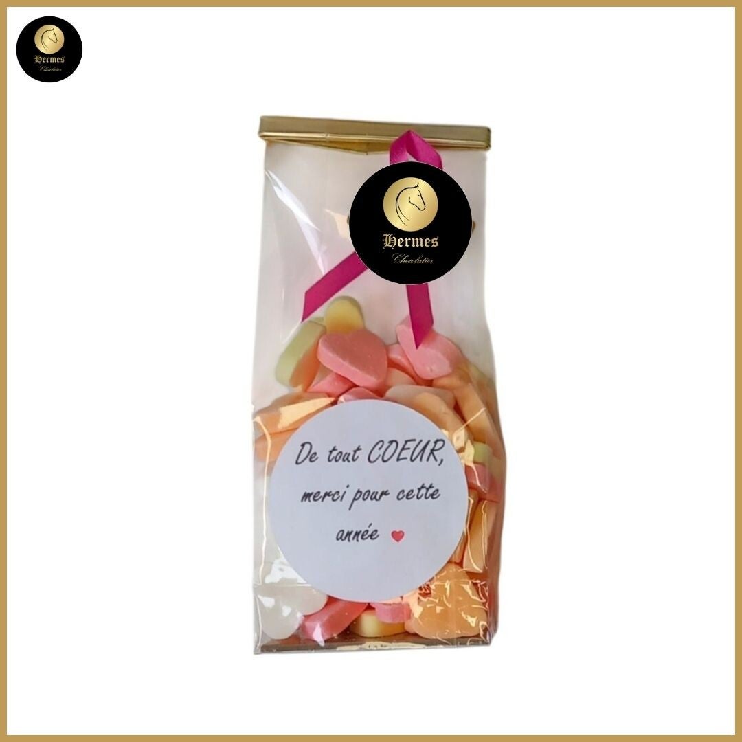 Sluit het schooljaar af met een zoet gebaar recht uit het hart! Deze stijlvolle geschenkzakjes zijn gevuld met zachte hartjessnoepjes en afgewerkt met een lint en een lieve boodschap: