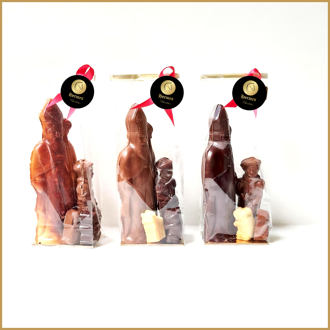 Een feestelijk duo van Sinterklaas (18cm) en Piet (12 cm), vergezeld van twee overheerlijke pralines in de vorm van diertjes. De pralines zijn gevuld met zachte, smeuïge praliné, karamel-pistache en vanille – een heerlijke combinatie van smaken die perfect past bij het sinterklaasfeest.