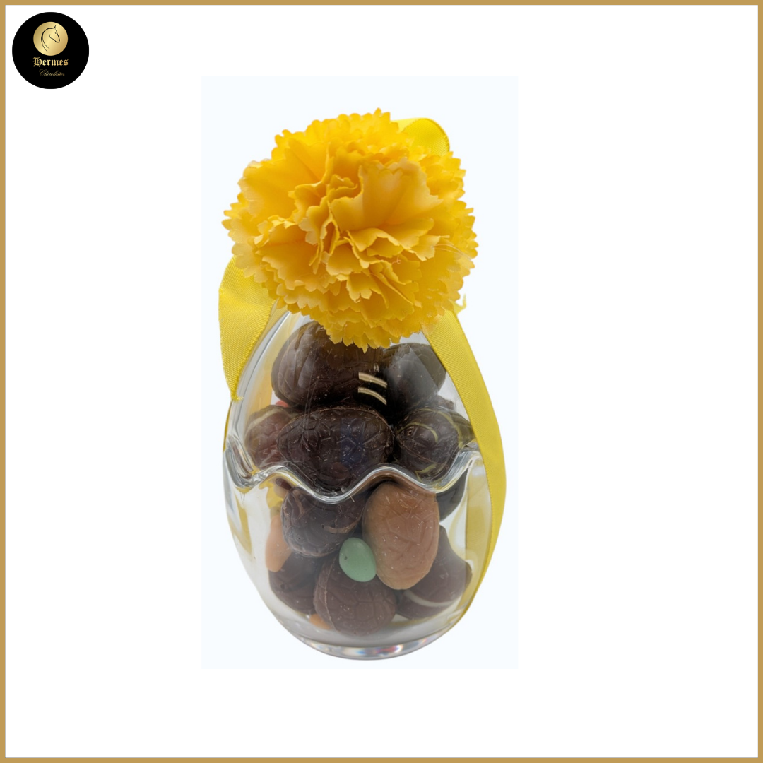 De bonbonbière van 13,5cm is gevuld met 20 eitjes en een holgoed ie van 6cm