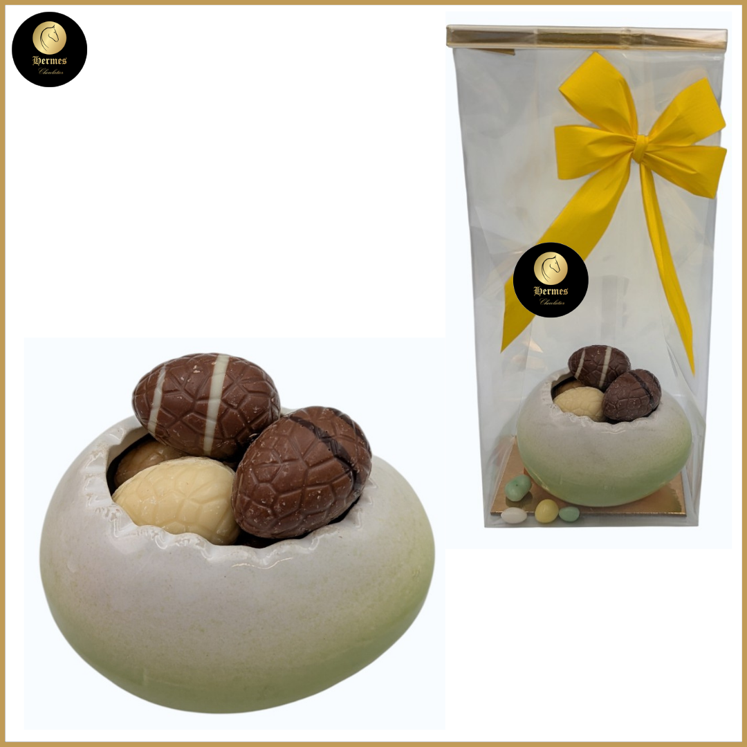 Deze schattige keramische eierschaal in groen-witte kleur is volledig gevuld met heerlijke chocolade-eitjes. Een klein maar fijn geschenk dat perfect past bij Pasen of op de feestelijke ontbijttafel.
