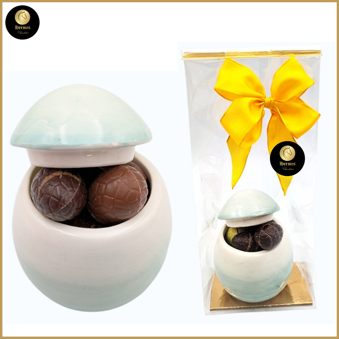 Deze eivormige bonbonière is gevuld 13 chocolade eitjes. Een klein maar fijn geschenk dat perfect past bij Pasen of op de feestelijke ontbijttafel.